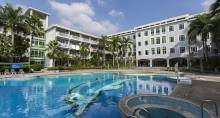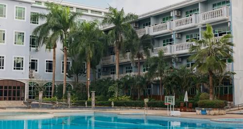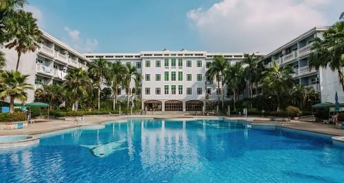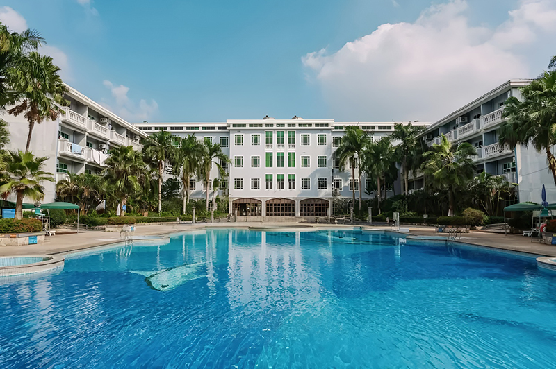 基地位于琼海官塘白石岭山脚下,地处官塘热矿水区域腹部,环境优美,依山傍水,风景宜人。酒店的浪漫风情与山水全景相得益彰,环境典雅,更有经专家鉴定的“世界少有,海南无双”的天然温泉热矿水,室内外温泉泡池错落有致,绿荫环绕,美景点缀,完美融入海南热带自然环境。